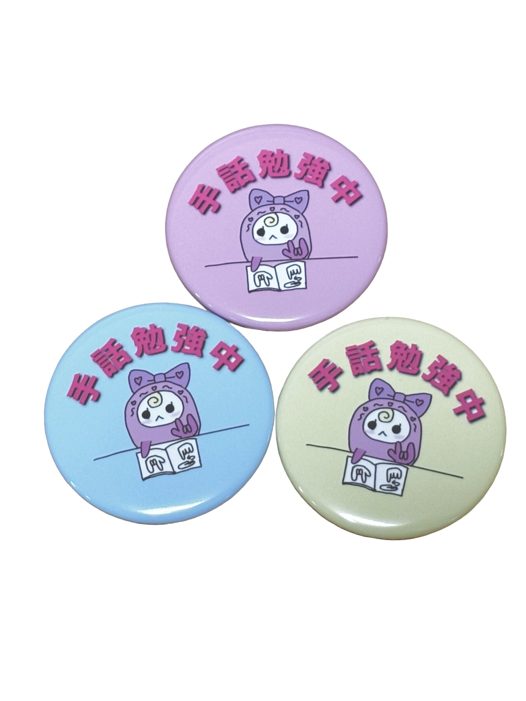 もちだるまが手話のお勉強をしてる缶バッジ♪